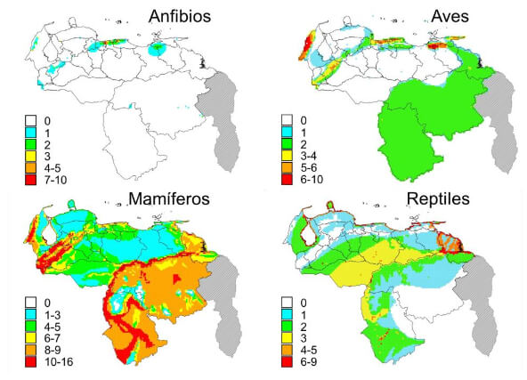 Las principales concentraciones de aves amenazadas están en los mismos sitios que los anfibios, solo que su importancia relativa difiere. La sierra de Perijá y el macizo de Turimiquire son los más destacados, seguidos por las cordilleras de la Costa y de los Andes. Para los mamíferos, los Andes representan la zona resaltante, con un componente significativo también al sur del río Orinoco. El mayor tamaño de las distribuciones geográficas de las especies de mamíferos se ve reflejado en una cobertura más uniforme de especies amenazadas a lo largo del país. El grupo que más difiere de los cuatro es el de los reptiles. En este caso, las zonas de mayor importancia son la línea de costa Caribe y atlántica, el delta del río Orinoco y localidades dispersas en el estado Amazonas. El patrón obedece a que 14 de los 25 reptiles amenazados son acuáticos (caimanes y tortugas marinas o de agua dulce), por lo que se concentran a lo largo de los cursos de agua.