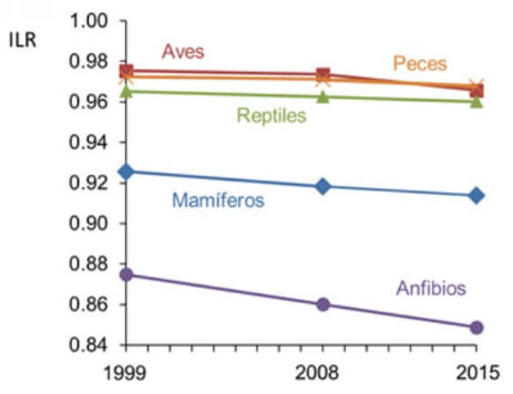 Una condición fundamental para aplicar el ILR es que el riesgo de extinción de todas las especies del grupo taxonómico debe haber sido evaluado. En Venezuela, esto se cumple para anfibios, aves, mamíferos, peces de agua dulce y reptiles. Aunque en 1999 no evaluamos la totalidad de las especies, el método estima cuál era su categoría más probable en esa fecha, lo que nos permite calcular el ILR de la fauna venezolana entre 1999 y 2015 (Fig. 4).